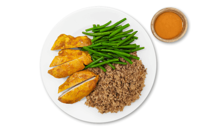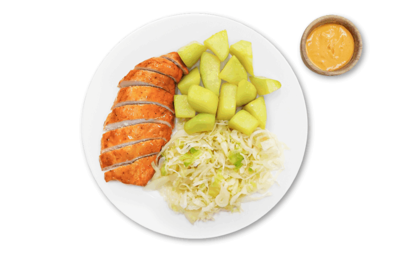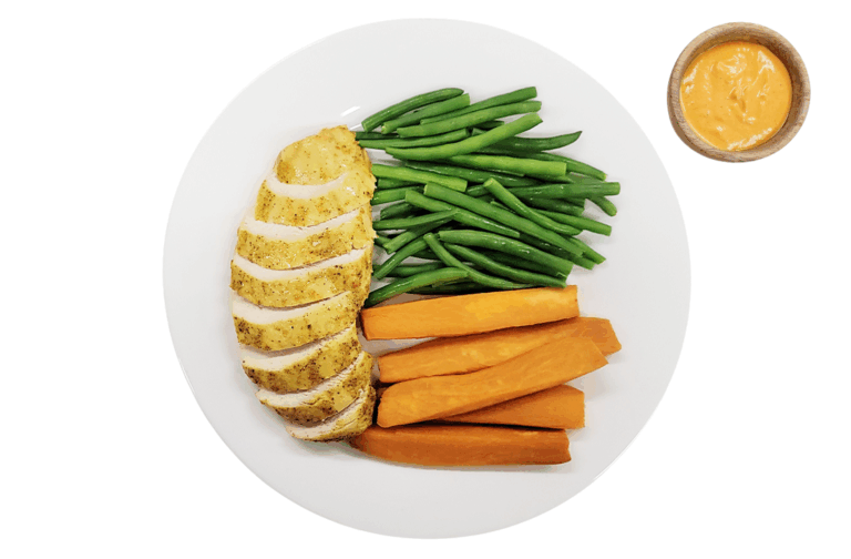 ATHLETE WITH CARBS – Chicken breast, sweet potato and greens. Served with our mayo-free plant-based chipotle aioli sauce.