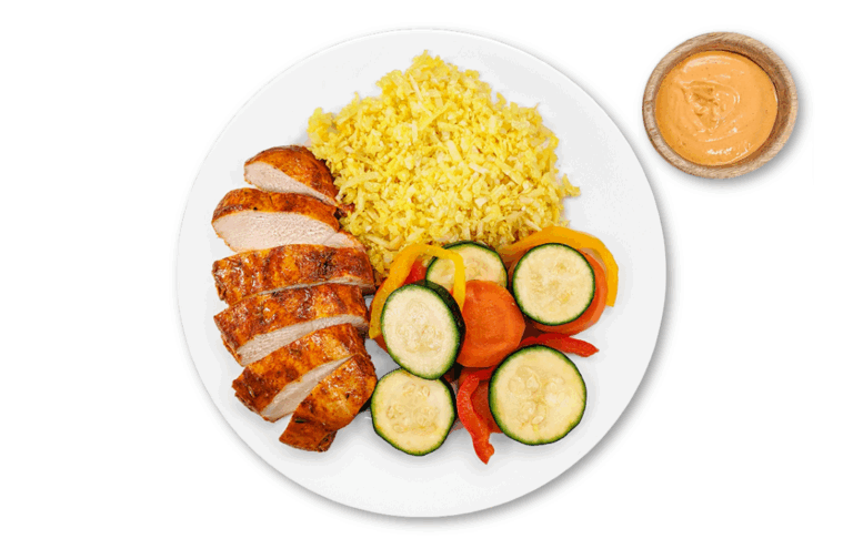 ATHLETE LOW CARBS – Chicken breast, cauliflower and seasonal veggies. Served with our mayo-free plant-based chipotle aioli sauce.
