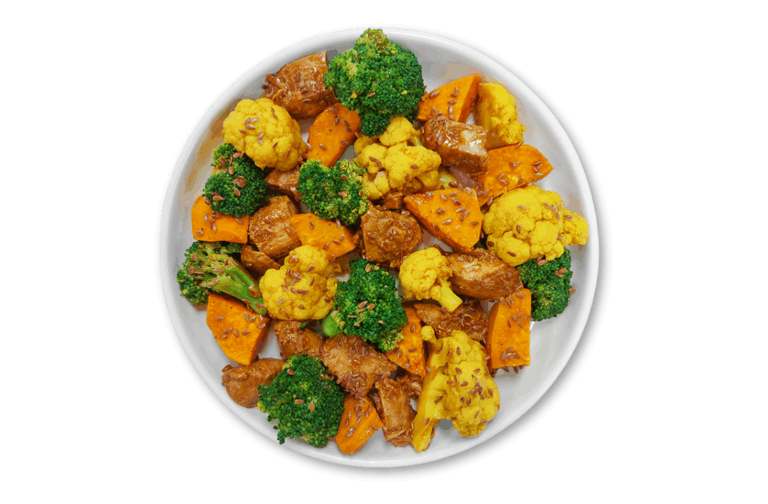 ATHLETE WITH CARBS – Chicken breast, broccoli, cauliflower, flax seeds and sweet potatoes, in our low sodium gluten-free teriyaki sauce.