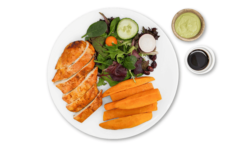ATHLETE WITH CARBS – Chicken breast, sweet potato and leafy seasonal greens. Served with our avocado sauce and our vinaigrette.