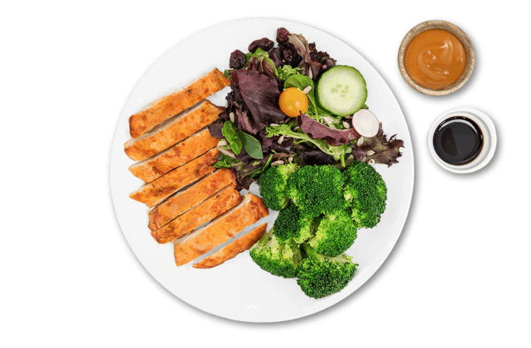 ATHLETE LOW CARBS – Chicken breast, double seasonal veggies. Served with our mayo-free plant-based chipotle aioli sauce.