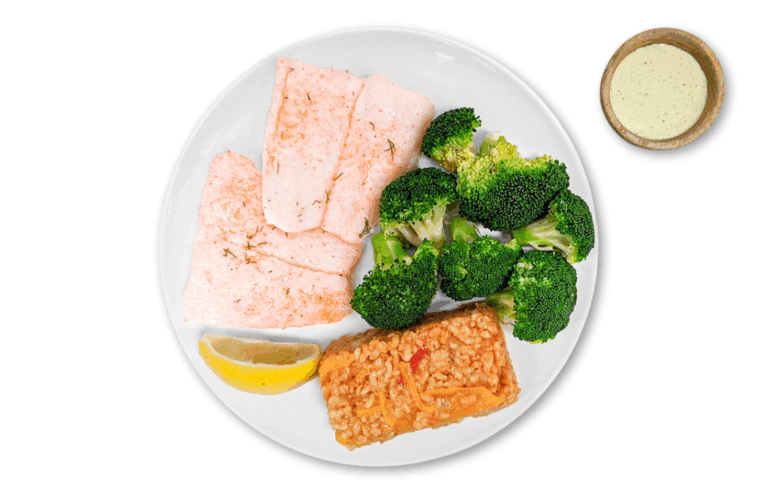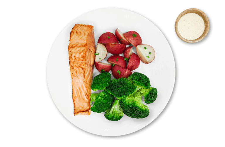 LIFESTYLE – Salmon, red skin potatoes and seasonal veggies. Served with our own mayonnaise-free tartar sauce.