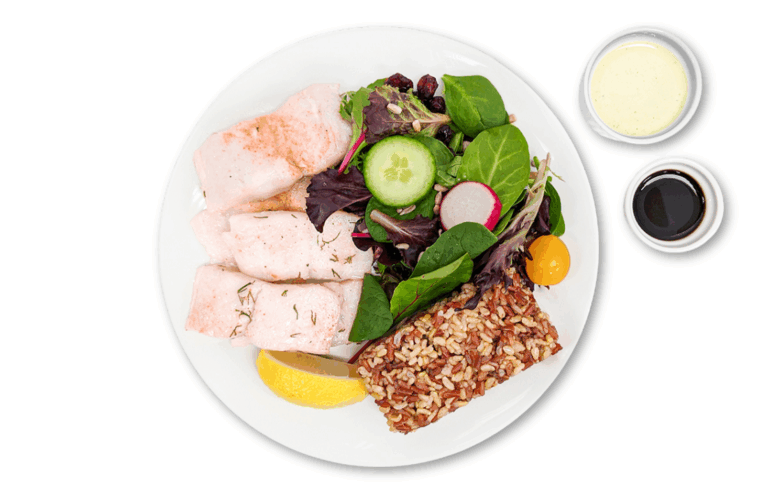 ATHLETE WITH CARBS – White fish, red & brown rice and leafy seasonal greens. Served with our garlic sauce and our vinaigrette.
