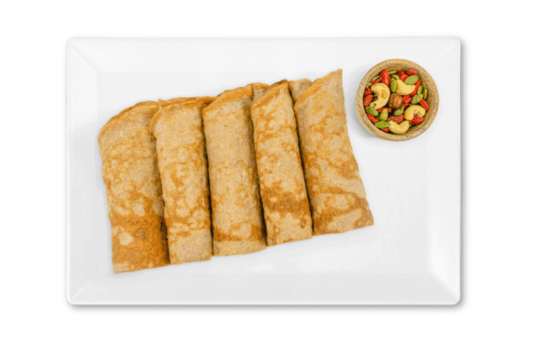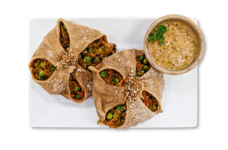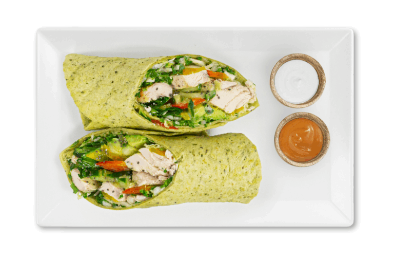 LIFESTYLE – Whole wheat spinach wrap with chicken breast, kale, mixed veggies, chia seeds and avocado. Served with our own garlic sauce and Peri Peri sauce.
