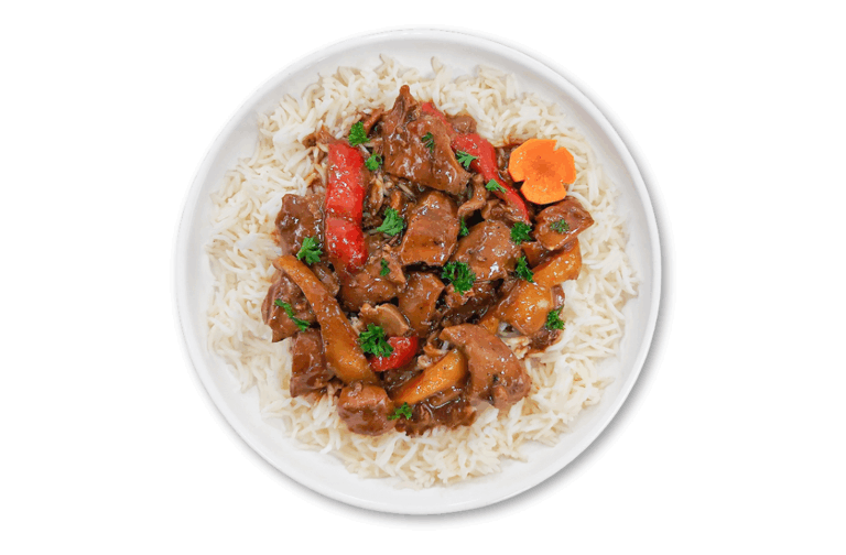 LIFESTYLE – Chicken thigh adobo with basmati rice, peppers and carrots. Contains gluten-free soy.