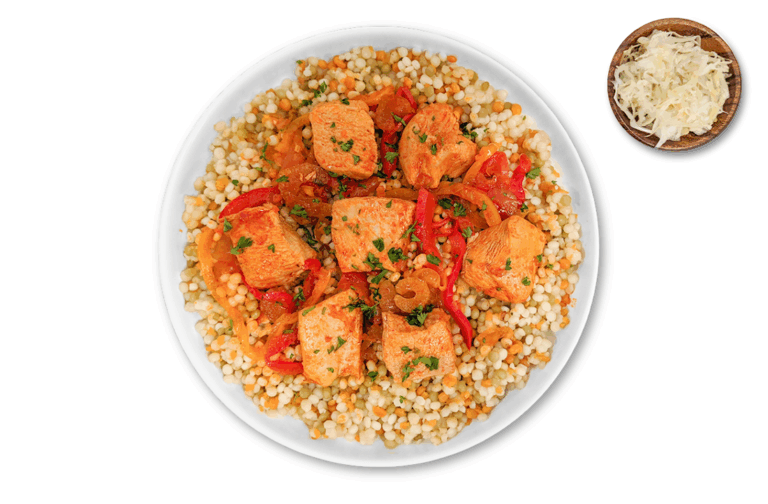 LIFESTYLE – Chicken breast stew with chickpeas, served over a bed of quinoa couscous with a side of raw homemade sauerkraut.