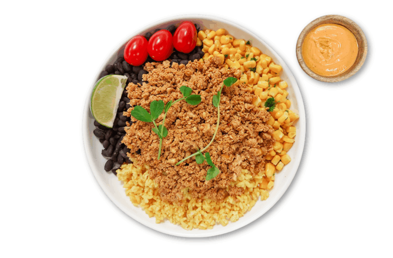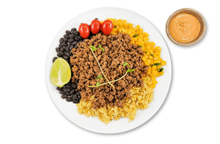 LIFESTYLE – Lean beef, brown rice, black beans, corn and tomatoes. Served with our plant-based chipotle sauce.