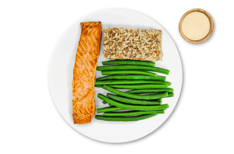 LIFESTYLE – Salmon, seasonal veggies and brown rice and lentils. Served with our own mayonnaise-free tartar sauce.