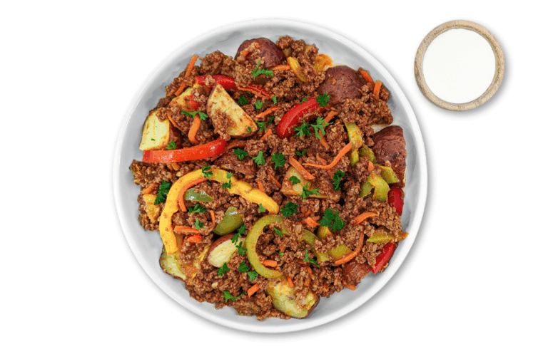 LIFESTYLE – Lean ground beef, red potatoes, peppers and carrots casserole. Served with pressed greek yogurt.