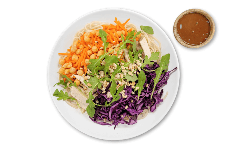 LIFESTYLE – Chicken breast, brown rice noodles, chickpeas, carrots, red cabbage, cashews. Served with our ginger and tahini dressing. Contains gluten-free soy.