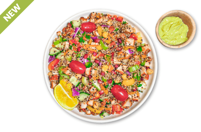 ATHLETE WITH CARBS – Chicken thigh, quinoa, chickpeas, cucumber, peppers, celery, carrots, tomatoes, red cabbage, parsley, pomegranate, lemon. Served with our own avocado sauce.