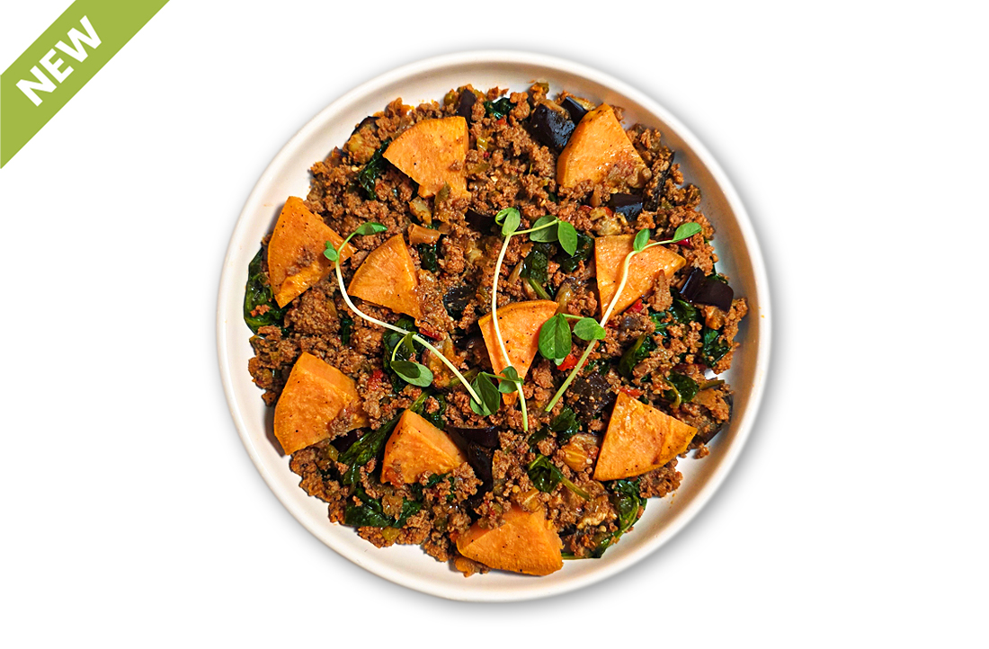 Turkey, sweet potato, eggplant, spinach, onions, celery, peppers and spices.